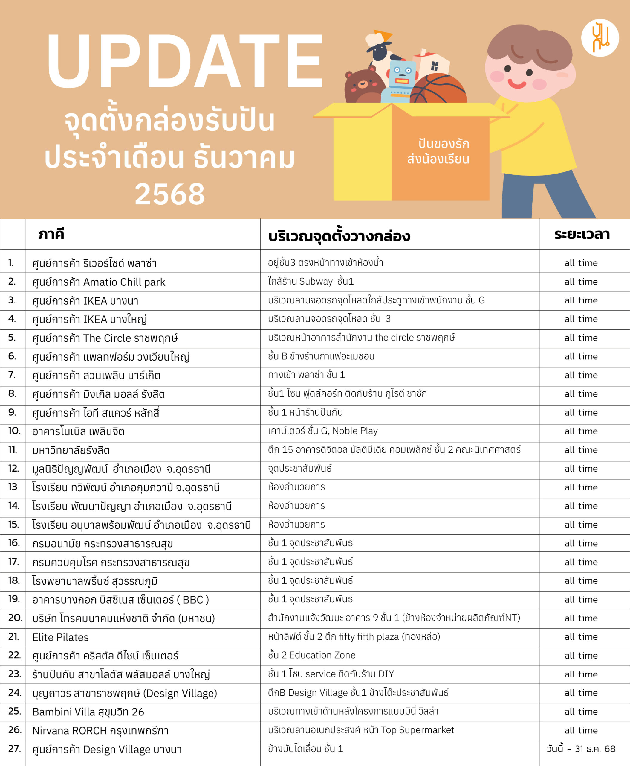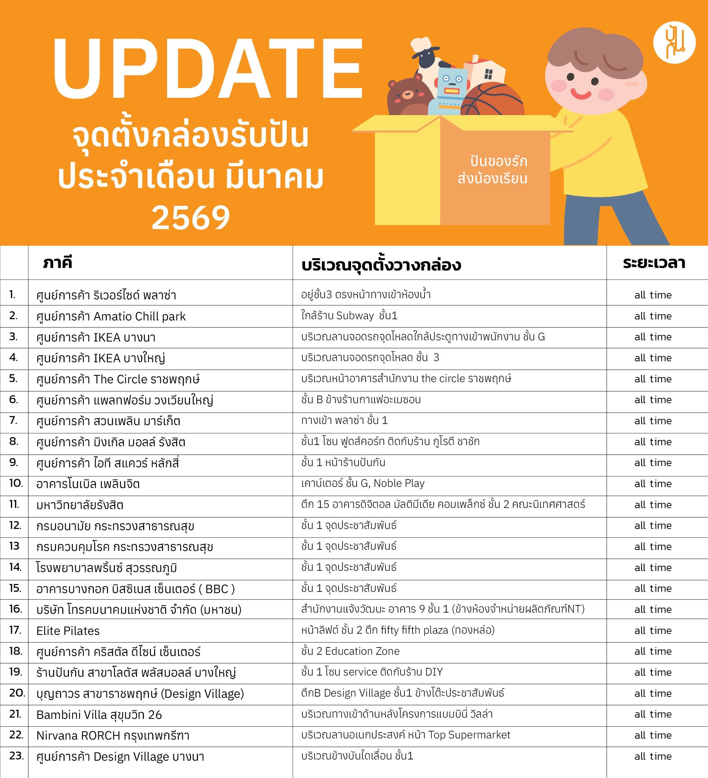 หน่วยงานใดสนใจอยากอนุเคราะห์พื้นที่วางกล่องรับปัน สามารถติดต่อเพื่อขอตั้งวางกล่องรับปันหรือสอบถามรายละเอียดเพิ่มเติมได้ที่ คุณสุวิชญา โทร 02-301-1021
